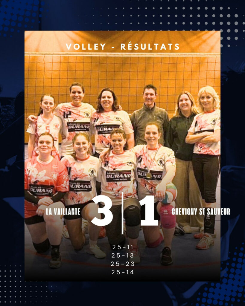 Après une victoire chez leurs adversaires mercredi dernier, les volleyeuses de La Vaillante ont récidivé et emporté 3-1 le match aller (report de début novembre) vendredi soir à domicile : 25-11 / 25-13 / 25-23 / 25-14.